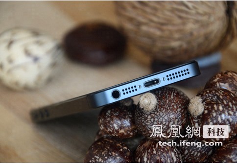 除此之外,侧面的最大改变是耳机孔被设计在了机身底部,而由于最新8针Lightning接口的体积较小,节省了一定的空间,也让外放喇叭被设计的更大,而外放效果和声音大小上与4S并没有太大差别。
