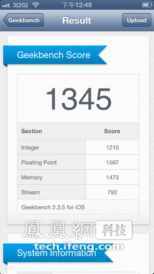 再来看看我们比较关注的硬件配置方面,iPhone 5采用A6双核处理器,在安卓四核当道的今天,这样的处理器明显不会给人们带来新鲜感,相反更多的人指责苹果在处理器的提升方面落后了。而其实这款A6双核处理器在跑分上不光不差,反倒很出彩,我们用Geekbench软件进行测试,iPhone 5测试得分为1346,高出4S(A5处理器)得分578为近三倍,在处理器这一项上,iPhone 5依旧走在智能手机的前列。同时,通过跑分软件我们可以看出,iPhone 5的RAM存储空间是1GB,也要高于4S的512MB。