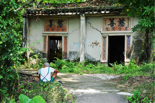 果然,转过几个路口后,我就见到这么一个画面 ,一老头独坐在这座民国时期兴建的善堂前,嘴里吃着桔子般大小的芋头,由于时下正午,烈日当空,难觅一处清凉,所以我决定与老头子交谈一番