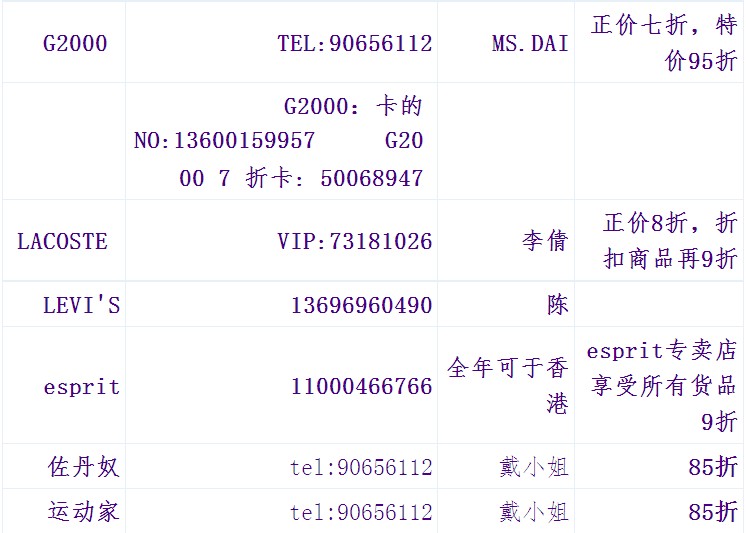 碧欧泉vip卡 : 90656112 DAI 倩碧vip卡 : 90656112 DAI Dior:90656112 DAI 兰蔻:90656112 DAI DHC 9折卡:OF00276036 (可折上折)运动家 (SPORTS HOUSE)& C.P.U 八折卡: tel 90656112 Dai G2000 7折卡: 90656112 Dai Crabtree & evenly 瑰柏翠 8折卡 90656112 Dai 歐舒丹 : 90656112 Dai 佐丹奴八折卡: 90656112 Dai Bodyshop: 90656112 Dai Guerlain: 90656112 Dai ...