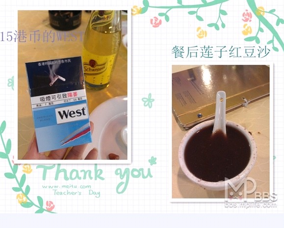 吃完还附送甜品,乍看是普通的红豆汤,里面有莲子哦,是很细的粉。不吃是不知道的。外加海边711买的香烟(贵啊,要45港币,图片里打错了。)
