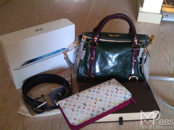 名人坊买的MIUMIU 的小号包子7000港币 +LV手包+F家的腰带,两面用的+IPAD