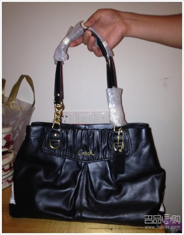 coach包包大多数都是有C图案的牛津布包,好不容易看到这一款黑色牛皮包,喜出望外,尤其是价格如此实惠,就毫不犹豫的买了,打算送给未来的婆婆,嘿嘿~拍照的时候上面缠绕的保护圈还没有解下来