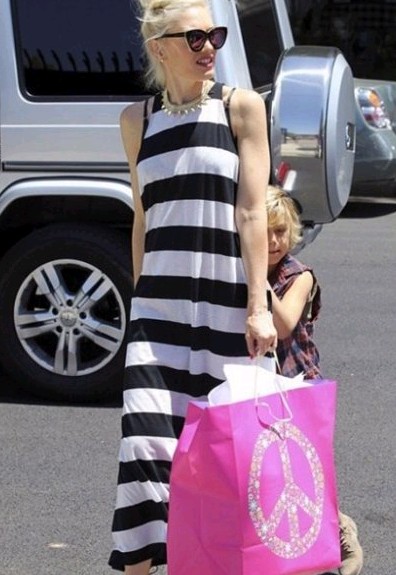 格温·史蒂芬尼清爽的黑白条纹连衣衫与黑色大墨镜,超酷!