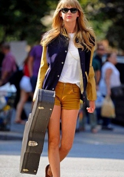 校园风的棒球衫适合这个秋天。可以像泰勒·斯威夫特一样搭配T恤短裤秀出美腿。