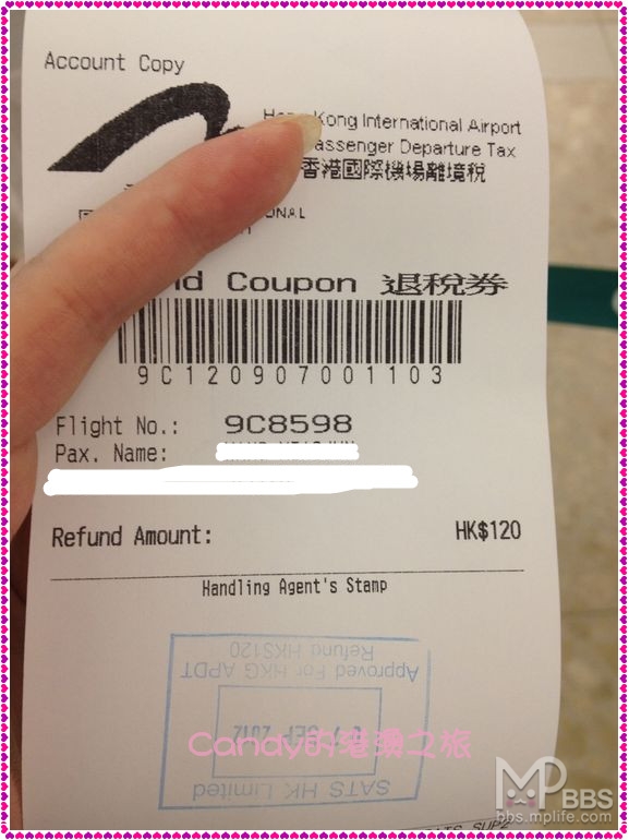 到了机场才6点多,我们以为不能换登机牌,没想到同意我们换登机牌,行李也托运了,然后竟然还退给120港币的机场税,意外的惊喜啊