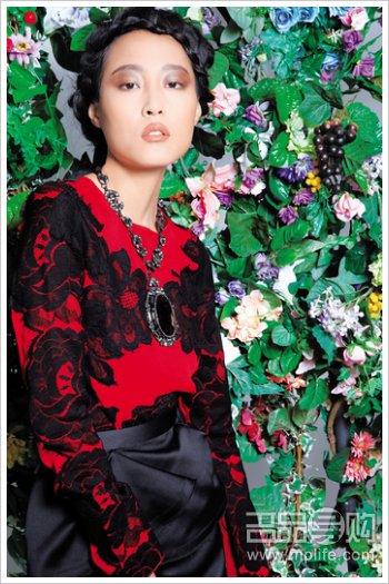 鲜红色缀黑色蕾丝通花图案连身裙 $51,700 黑色丝缎绉褶及膝裙 $16,900 银色叶花颈链缀红色宝石垂饰 $19,200 (all from Lanvin)