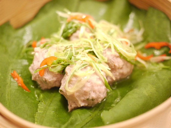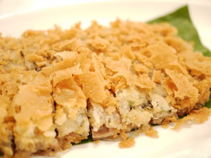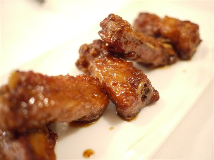 那夜的鸡油花雕蒸花蟹深入人心,还未见上桌就已闻到阵阵的酒香飘来。两斤重的花蟹膏满肉肥,爽甜无比,令在座绅士淑女也顾不得仪表,大刀阔斧地一扫而光,然后将店家自制的陈村粉放入黄澄澄的混有十年陈花雕酒的鲜鸡油中捞着吃,滋味鲜美口感嫩滑,很是过瘾。龙井菊花熏乳鸽来头不小,这乳鸽是美食家江孔殷太守的孙女、著名食谱作家江献珠为店家特地寻来的优质上品,鸽肉细腻鲜嫩多汁,骨质很软,似有若无的龙井和杭菊香带出浓浓的烟熏味,飘渺却打动人心。十八味鸡是每桌都不错过的,花椒、豆蔻、八角、丁香加豉油调制的卤水浸制本地的三黄活鸡,香料味窜鼻,鸡肉嫩滑鸡味浓郁,吃不停箸。酥炸狮头鱼配陈醋也是见菜名就有冲动点,狮头鱼是新鲜海鱼,在清橄榄汁中浸足二十四小时令其鱼骨软化,炸得鱼皮金黄香脆,鱼身鲜美多汁,自制陈醋加了鱼露和柠檬调味,口感浑厚醇香,立即提升鲜美层次。