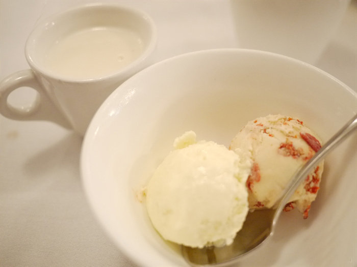 饭后的桂花杞子雪糕和杏仁茶也出尽风头。加了北海道牛奶的雪糕入口超香浓幼滑,桂花浸过的枸杞有淡淡的桂花香。而杏仁茶只用北杏手磨,杏香味极浓郁。更刁钻的是卡布奇诺咖啡,用的单一哥伦比亚咖啡原豆,店家自己隔天烘焙,稠密而入口细腻,小小一杯适合饭后慢慢啜。