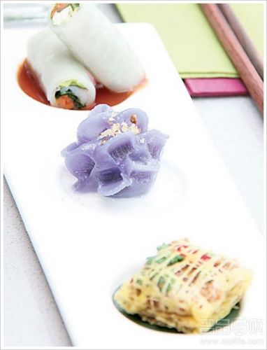 精致的头盘包括蛋网包住的虾肉(前)和清香的杂菜米卷(后),最特别当然是精美的花饺(中),以蝶豆花水混入粉团内,并包入鸡肉和杏仁,再由大厨以人手钳出花的形状,造型精致。