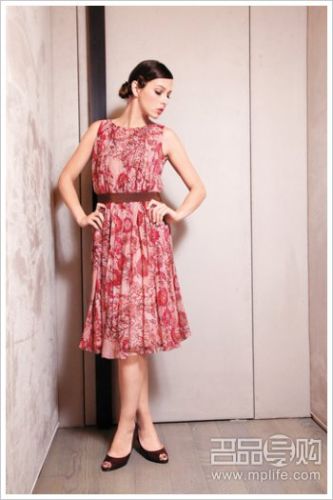 粉红色花卉图案雪纺背心裙 $12,480 深枣红色高跟凉鞋 $3,680