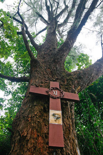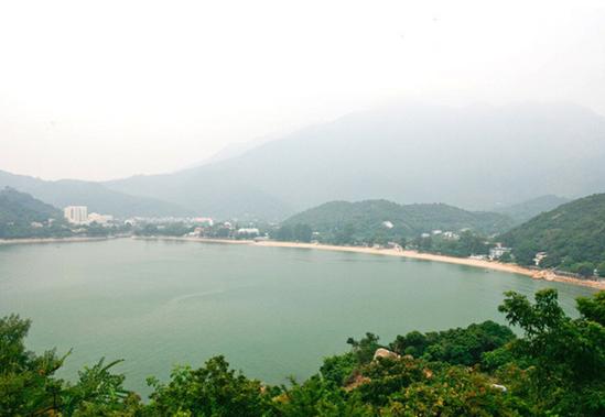 从梅窝码头靠右行至银矿湾沙滩,沙滩尽头接小径上行上山,留意左方有石级路口,简单指示牌往稔树湾及愉景湾。沿石级上山,走完起伏山路,到达250米高的山坳顶,这处建有红柱绿顶四角坊亭,可在此小休及欣赏四周景色。可以俯望海上多个岛屿和迪土尼乐园。