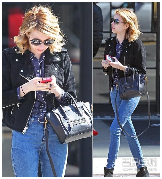 Emma Roberts同样是Nano的fans,小巧的身形和囧包倒是很相配,一袭黑色夹克搭配黑色裸靴,和黑色的囧包相呼应。