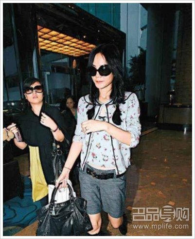 这款黑色小号的巴黎世家机车包是很经典百搭的一款。王菲身着印花两件套开衫搭配灰色短裤配上长筒的流苏唐卡黑色靴子十分舒适有活力的装扮。尤其是她随意扎起的两个小辫子更家可爱俏皮。