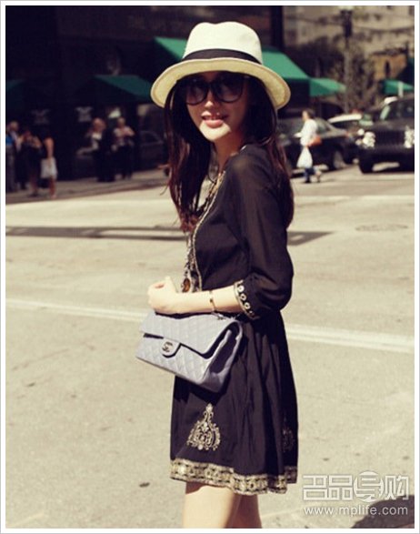 呛口小辣椒金色刺绣的黑色连衣裙有一种名族感,蓝色的香奈儿包搭配,大走民族大牌风