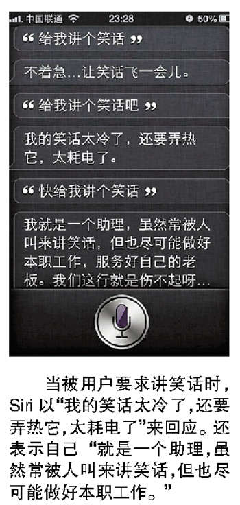 由于苹果手机的Siri非常受网友欢迎,所以从网上的情况来看,网友“调戏”Siri的问题无所不包,各种奇怪的问题令人捧腹。记者从网友上传的截图上看到,有网友问Siri:“人是从哪里来的?”Siri答:“看来还是得帮你在网上找一下‘人是从哪里来的’吧。”网友对Siri说:“晚安。”Siri以诗句回答:“晚安卸下了翅膀,轻轻打开梦里的窗。”还有网友模仿记者的样子问Siri:“你幸福吗?”Siri答道:“对不起,我恐怕无法回答这个问题。”