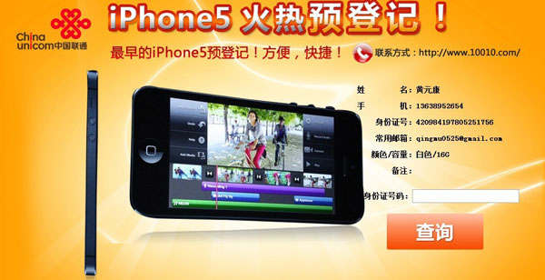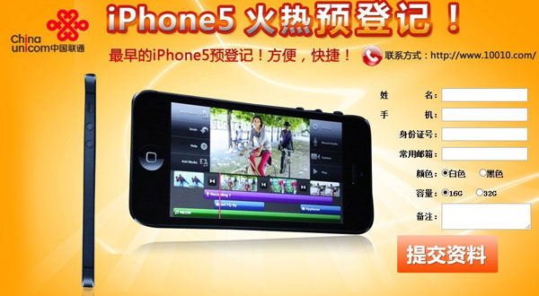 从广东联通iPhone5预订网页来看,上面显示“最早的iPhone5预登记、方便、快捷”,除此外并未透露更多iPhone5信息。预订用户需要填写姓名、手机号码、身份证及邮箱信息,页面提供16/32G黑白两色iPhone5预定,提交预订信息后页面提醒预订成功并显示相关预订信息。(广东联通iPhone5预订网址:http://www.gd10010.cn/sh/ip5/orderiPhone5.jsp)