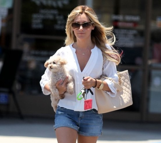 Ashley Tisdale 白衬衫及丹宁短裤,肩背米色压纹小牛皮链带包,一派轻松简约。