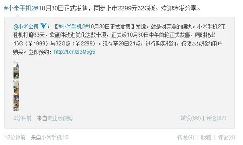 据悉,小米手机2将于本月30日中午开始发售,首轮共有5万台,而第二轮开放购买将会在11月中旬开始,共有25万台。与此同时,小米官方还公布了小米手机2的32GB版本售价为2299元。不过具体的16GB/32GB版本分配数量目前还没有明确消息透露。