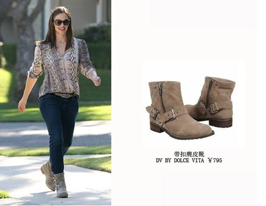 詹妮弗-加纳(Jennifer Garner)裸色短靴搭配印花衬衫与牛仔裤更多出一丝潇洒爽朗。
