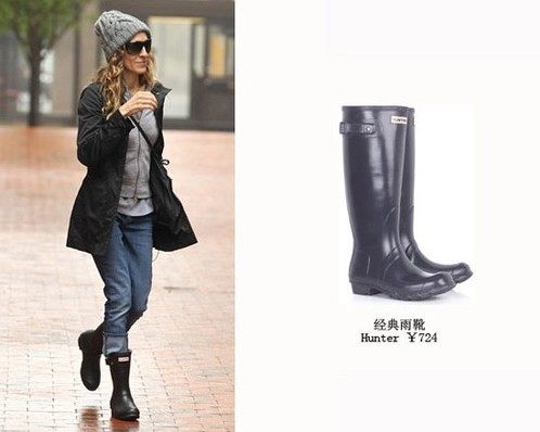 萨拉·杰西卡-帕克(Sarah Jessica Parker)绒线帽+雨靴低调出街,黑灰上衣经典搭配不过时。