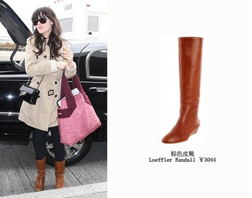 佐伊·丹斯切尔(Zooey DesCHANEL)双排扣配棕黄色靴子诠释英伦搭配的精髓。