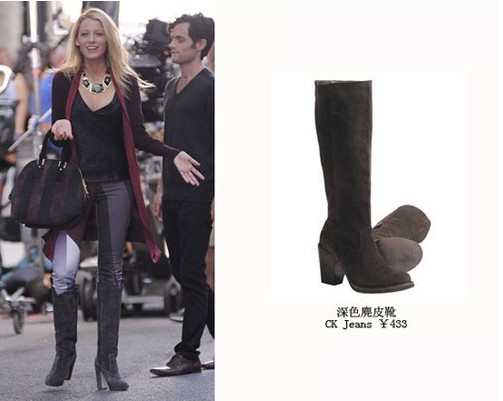 布莱克·莱弗利(Blake Lively)酒红色天鹅绒上衣抢镜,拼接裤袜+长靴女展现王气十足。