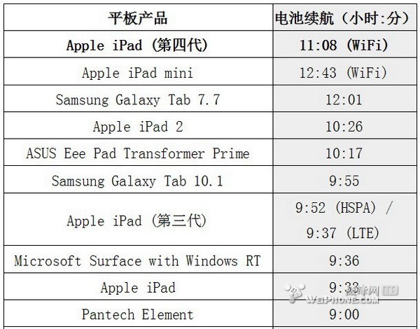 如果单纯只提升硬件而不考虑电池续航,那任何的硬件更新都毫无意义了。好在 iPad 4 兼顾了性能的同时,也没有牺牲电池续航。首先我们进行标准的测试,设置好一定的屏幕亮度,打开 Wi-Fi,iPad 4(Wi-Fi版) 可用 11 小时 8 分钟。在评测 iPad 3 时,我们手中的设备只有 4G 版,所以上次所测出电池续航时间也只有 9 小时 52 分钟。