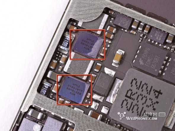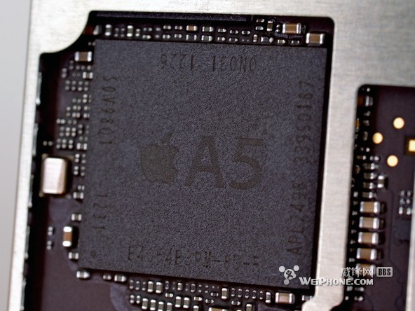 A5 芯片上显示的 E4064P3PM-8D-5 说明它使用 32nm 制造工艺,内部是2 Gb LPDDR2 RAM