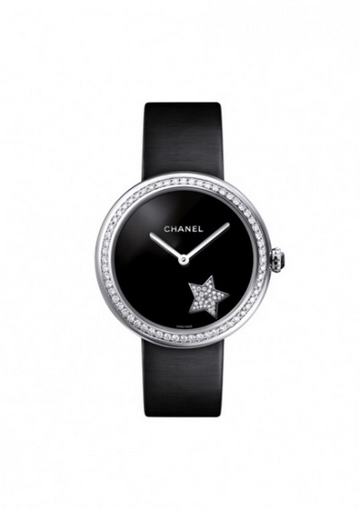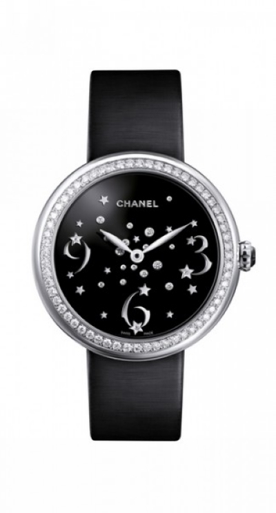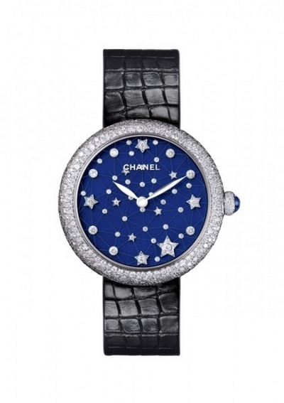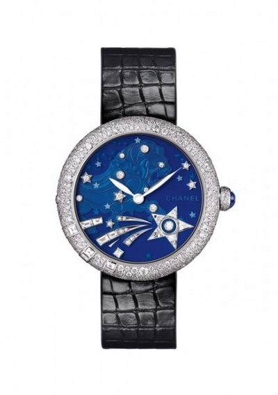 “Mademoiselle Privé”系列腕表,Etoiles filantes星空表盘18K白金表壳镶嵌60颗明亮式切割钻石(1克拉),黑色漆面表盘,镶嵌19颗明亮式切割钻石。