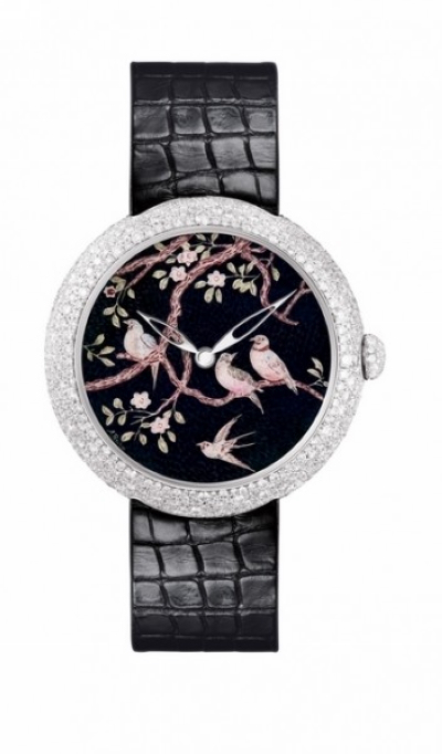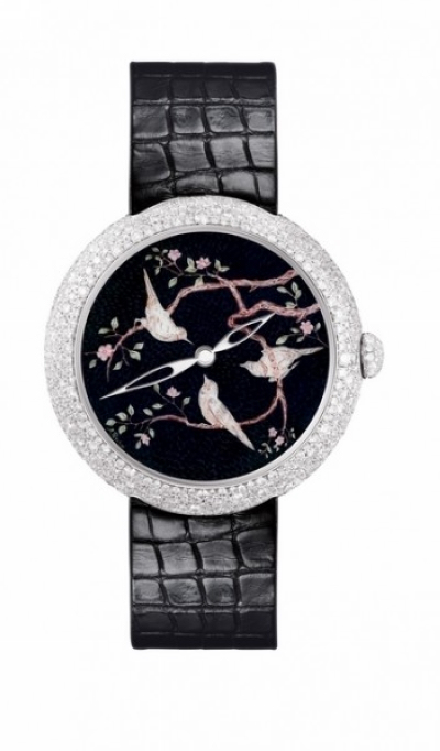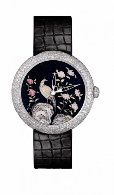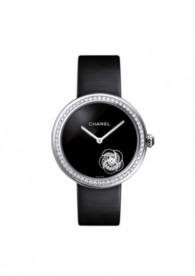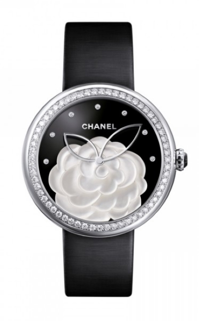“Mademoiselle Privé”系列腕表,Camellia珍珠母贝山茶花表盘18K白金表壳镶嵌60颗明亮式切割钻石(1克拉)。缟玛瑙表盘上饰以珍珠母贝雕刻而成的山茶花,镶嵌7颗钻石时标。防反光处理蓝宝石水晶镜面。蛋面切割缟玛瑙表冠。黑色缎面表带。针式表扣镶嵌80颗明亮式切割钻石(0.4克拉)。高精准石英机芯。