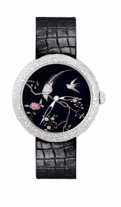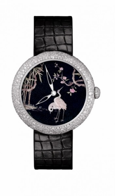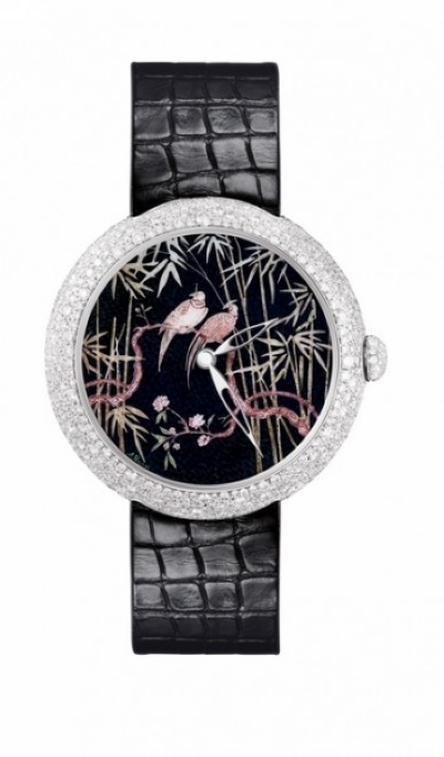Coromandel东方屏风表盘独一无二表款,瑞士手工制造。18K白金表壳,669颗雪花式镶嵌钻石(3.1克拉),以日内瓦传统的大明火珐琅工艺*烧制成的表盘上,描绘有精美的微绘图案。