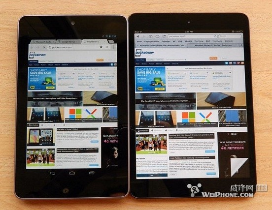 从对比图片来看,谷歌的7英寸平板 Nexus 7 明显比 mini 纤细,但是在高度上不如 iPad mini。