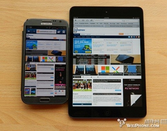 首先是 iPad min i和 iPad 3 的对比,iPad 3 的尺寸为9.7英寸,iPad mini 的尺寸为7.9英寸,在 iPad 3 面前,mini 显得十分小巧。