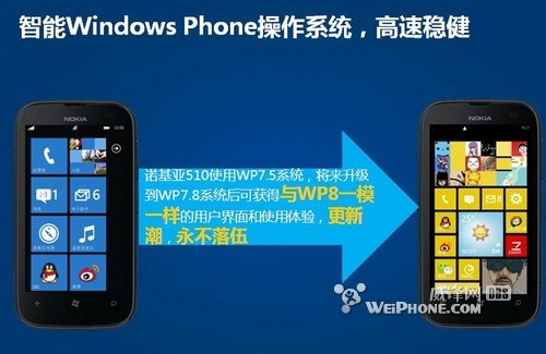 很明显,Lumia 510 与 Lumia 610 一样,主打低端市场。鉴于后者在国内的热卖,Lumia 510 的推出并不让人意外。相较于 Lumia 610,Lumia 510 的屏幕尺寸更大,但内部存储空间却要低一些。当然了,它同样支持升级至 Windows Phone 7.8。