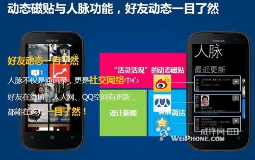 与之前在中国大陆市场发售的 Lumia 系列产品不同,国行 Lumia 510 的人脉中心中深度整合了新浪微博、人人和 QQ 空间。相信这对于国内许多手机用户来说,是一个颇有诱惑力的特性。从此,国行 Lumia 中的人脉系统再也不只是一个单纯的通讯簿了。
