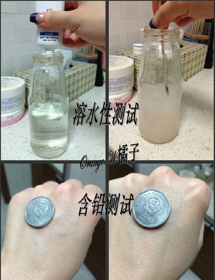 * 上图:溶水性测试。将BB霜挤入装着清水的玻璃瓶里,搅动一下,BB霜与水融合在一起,清水变成了乳白色,这样证明这款BB霜溶水性比较好,不容易堵塞毛孔,不用担心用了会长痘痘。