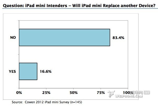据悉,此次共有 1225 名用户接受调查访问,有 12% 的受访者表示他们计划在未来 18 个月内购买 iPad mini,这 12% 的受访者中有 52% 的用户没有购买过平板电脑。在关于 iPad mini 是否会取代其他设备的问题上,83.4% 的受访者表示不会。