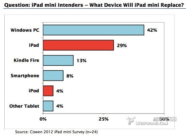 另外,在 iPad mini 将会取代哪一款产品这项问题调查上,仅有 29% 的受访者认为 iPad mini 会抢占 iPad 的市场。作为对比,一共有 42% 的受访者认为 iPad mini 会蚕食Windows PC 的市场份额。