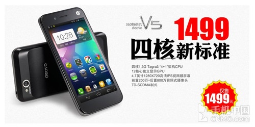 值得一提的是,360特供机deovo V5搭载了一枚1.3GHz主频的NVIDIA Tegra 3 四核处理器,该处理器被称之为“全球唯一一款‘4+1’四核处理器”,并配备1GB RAM和4GB机身内存(支持MicroSD卡扩展),而操作系统则是Android 4.0,软硬件配置均是目前的高端水准。
