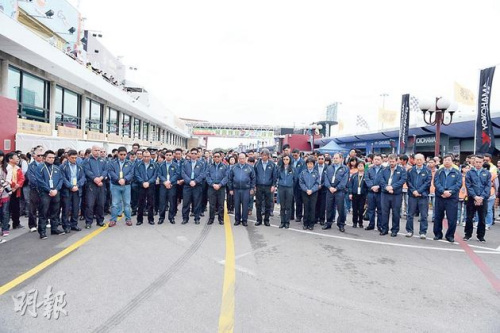 昨晨天色阴冷更下起微雨,赛道湿滑。上午11时许,赛会在开赛前为两名丧生车手默哀1分钟,赛道两旁观众及维修站工作人员一同站立致哀,场面伤感,有观众坦言接连两日有车手丧命,观战心情沉重。