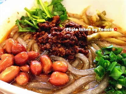 上面一坨肉碎,加上旁边的花生和芫茜,底下是透明粗身的薯粉,浸在接近黑色的辣油里。