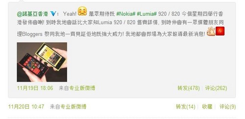 消息人士向香港媒体透露称Lumia 920港行版本将会在11月28日正式开始开卖,而23日到28日之间用户可以在诺基亚专卖店预定Lumia 920。