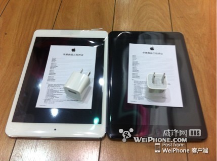 国行 iPad mini 将于本月 7 号正式发布,但是在发布之前,国行版的 iPad mini 真机已经提前现身论坛,一位 ID 为哼泥小猪的会员将黑白两款 iPad mini 的图片发到 iPad mini 综合讨论区之中,并声称 iPad mini 配备美版的充电器。此外,该会员还表示,美版的充电器上印有中文。