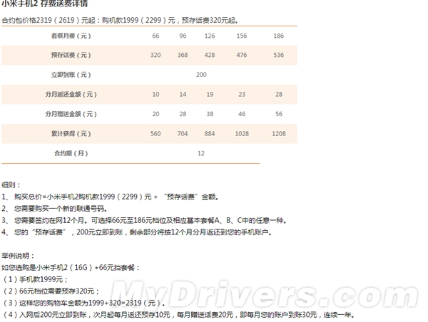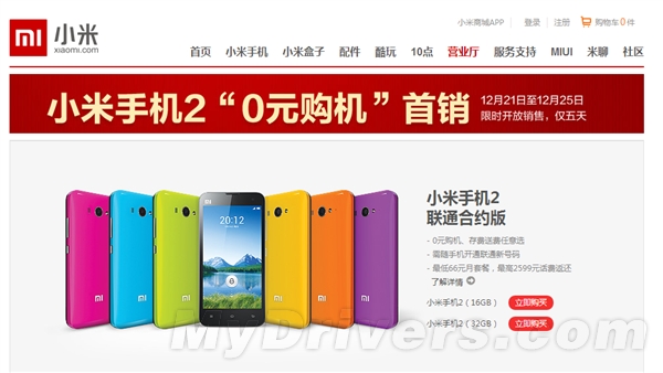 小米官方发出公告称,用户可以在12月21日-25日这五天时间里购买联通版小米2代,其中有16GB和32GB两个版本供选择,与此同时,预存2599元的话费,用户可以免费获得一部小米手机2。PS:不想抢MI2的用户可以买合约机了。