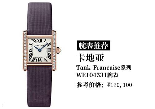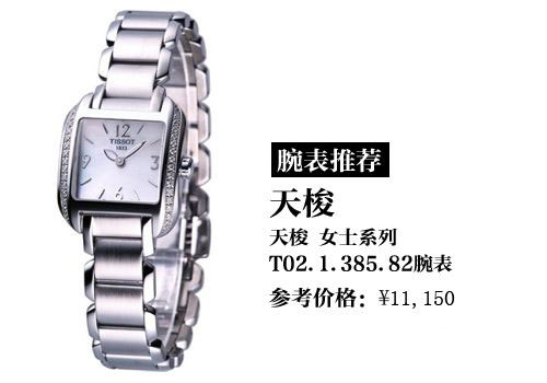 推荐一款精钢表带的纤细表款,天梭T02.1.385.82腕表,采用优质石英机芯,保证了走时的精准。在腕表设计上,与前面推荐的卡地亚坦克表款不谋而合,在表盘两侧镶嵌细密钻石,设计典雅迷人。以条状时标与数字时标穿插排列,并搭载镂空指针,配上优雅的纤细精钢表链,正是凸显女性柔美特质的绝妙武器。