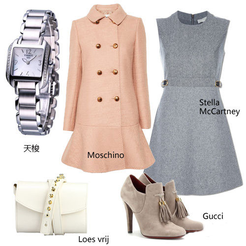 浅灰色的连衣裙总能很好地衬托女性气质,搭配长款的呢子外套,更显得时尚大气。今季流行的橘粉色系呢子大衣,在衬托肤色的同时,更能凸显女性柔美。再佩戴编辑精心挑选的天梭T02.1.385.82腕表,更能散发女性甜美温婉的动人气息。