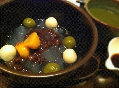 甜品二: 红豆白玉寒天 , 有栗子, 红豆, 寒天, 白玉... 配上黑糖汁, 不会太甜, 但如果不喜欢和菓子的朋友就不用点了