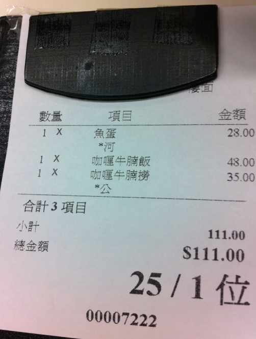 买单的时候,还闹了个小笑话,把1块钱的港币当10块钱给服务员了。还好那位阿姨没有说我。鱼蛋粉28,咖喱牛腩饭48,咖喱牛腩捞公35,不另收服务费,一个用了111块钱。在香港来说算是比较实惠的了,确实是不错。
