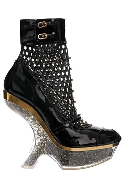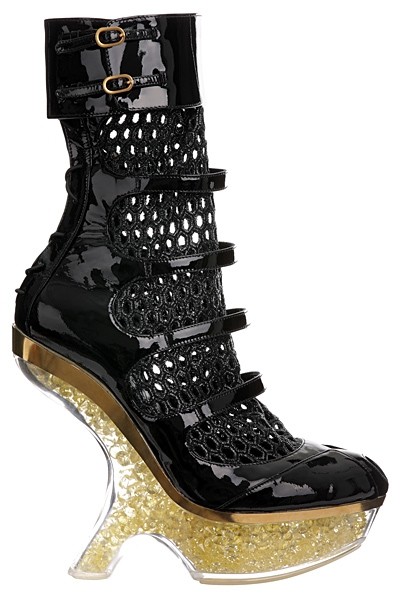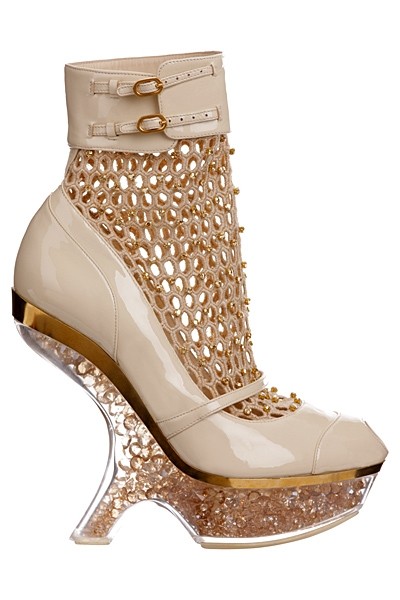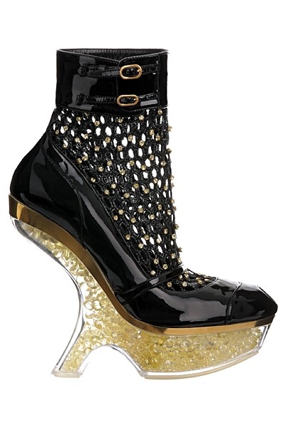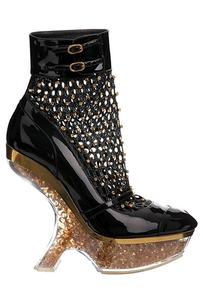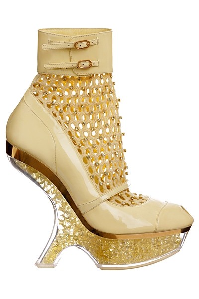 Alexander McQueen 2013春夏系列将麦昆式的华丽与个性融入其中。闪亮的水晶装在鞋跟里,随着步伐的移动,以不同的折射面带来别样迷人的光芒。勾人的弯跟鞋也是这一季的重头戏,点缀鞋头的经典骷髅或者铆钉和蜂巢镂空效果都能为鞋款带来别具风情的穿搭诱惑。